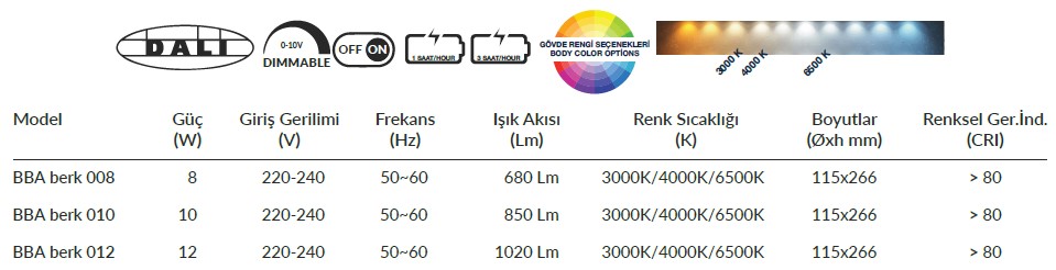 Elektrostatik toz boya kaplı alüminyum gövde. Yüksek verimli ve uzun ömürlü LED. Yüksek renksel geri verim indeksi. Yüksek ışık geçirgenliği ve homojen yayılıma sahip cam. Yüksek verimliliğe sahip LED sürücü.